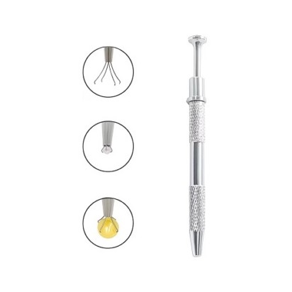 This tool, also known as a jeweler’s pick-up tool or terp pearl grabber, typically features a pen-like design; pressing a plunger at one end extends four claws at the other to gently but firmly grasp small objects.