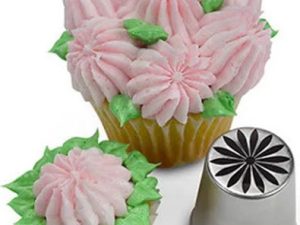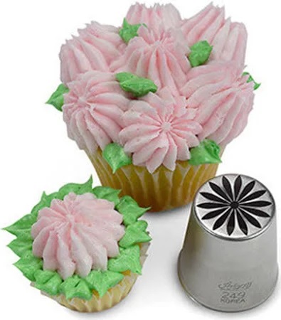 - A stainless steel tip that creates detailed floral designs and is popular for decorating cupcakes and cakes.