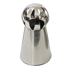 The Ateco 271 Russian Ball Tip is a stainless steel, spherical piping tip with a straight-cut opening, designed to create intricate ruffles, swirls, and floral designs on cupcakes and cakes with a single squeeze. It works best with thick, stiff buttercream, producing large, professional-looking decorations with minimal effort.